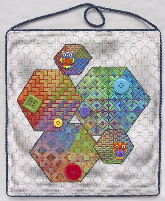 Jennifer Riefenberg taught this class piece at NAN Assembly last year. It was fun to see what happens when the same thread color and stitch are worked on top of a painted color wheel. The buttons were found and added to enhance the five color patches. The background darning pattern was enlarged to be more complex and added a second shape.