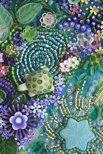 Once I started again, it was like eating potato chips. I couldn’t stop. More beads, more sequins; add another butterfly; make a pond for the turtle! And oh, there is a ladybug also; and never enough sequin flowers!