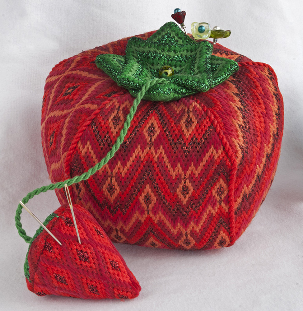 The tomato-shaped pincushion is designed on congress cloth with 5 oblong panels using 5 different bargello patterns. In all the patterns, Debbie mixes a wonderful variety of interesting threads such as Burmilana wool, Threadworx overdyed floss, Fyre Werks, Flair, Petite Very Velvet and Anchor flosses. As I was stitching the various bargello designs in the individual segments, I came to realize that a lot of the texture and interest came from the threads themselves and how they were used in combination to form the patterns. The added attractions of the attached leaves and the strawberry make the pincushion even more dimensional.