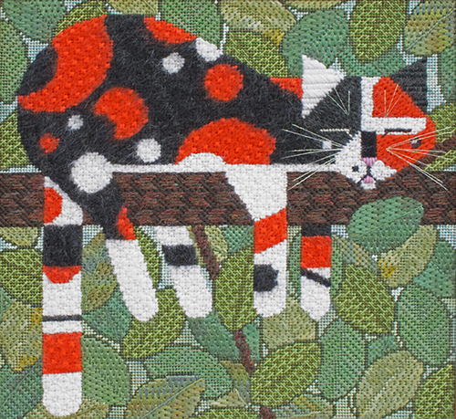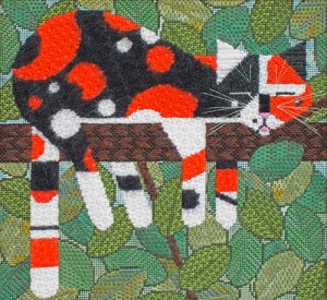 This turned out to be a great design for using stash threads, including a Twedie #18 and Medici for the tree branch and limbs. One stitch that surprised me was using the star octagon stitch for the white fur on the kitty. I wasn’t sure if this stitch was going to provide the effect I was looking for, but upon further thought, it would be fun to do the entire kitty in this stitch, changing thread colors in the appropriate areas and the end result, I think, would be very much like a curly-haired Cornish Rex kitty; just a thought for a future project.