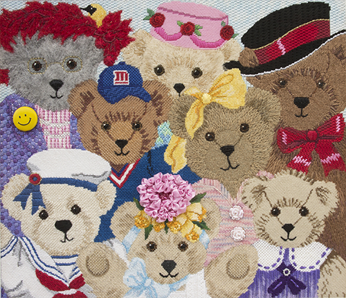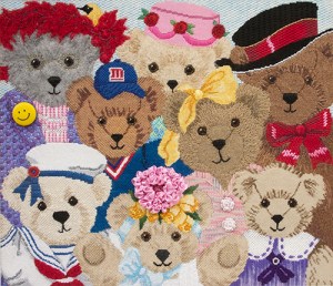 I could not resist the challenge of stitching the hats on this group of bears. The headpieces were finished several years ago, except for the ribbon rose. Jennifer Riefenberg taught me the ribbon technique just a year ago. The faces were completed last year. I created different textures by using a variety of threads (wool, petite velvet, and silk and wool). Brushed basketweave, skip tent, and interlocking gobelin were the stitches used.