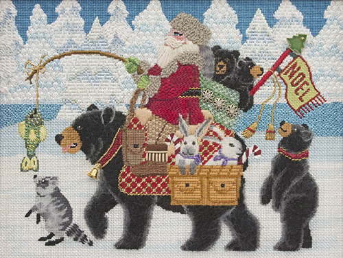 We spotted bears in Alberta, Canada. To define the many now-covered trees, I used a variety of sparkly, light blue and white threads. Stitches include the Victorian step and variations, such as Venetian. Helen’s original lace and diamond ray were used for some of the trees. Skip tent was used for the snow so the painted light-blue shadows would show through. Combined Wisper and Medici wool in basketweave made the bears’ fur look fuzzy. Museum quality glass was a must to prevent the expected viewer temptation to touch the textured bears.