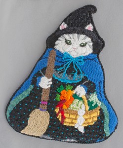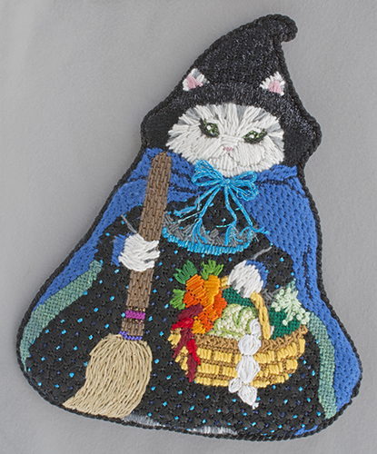 Mildred started as a dede canvas with a very simple face. I was given a picture of a friend’s cat to personalize her face with long and short and satin stitches with Overture and Burmilana threads. The bow was made using 2 strands for a fork bow. Many different stitches are included in the harvest basket – long stem knots, alternating upright cross, stem outline, queen stitch, lazy daisy and satin. The cape was stitched with Debbie Stieler’s Diagonal Stairs Stitch.