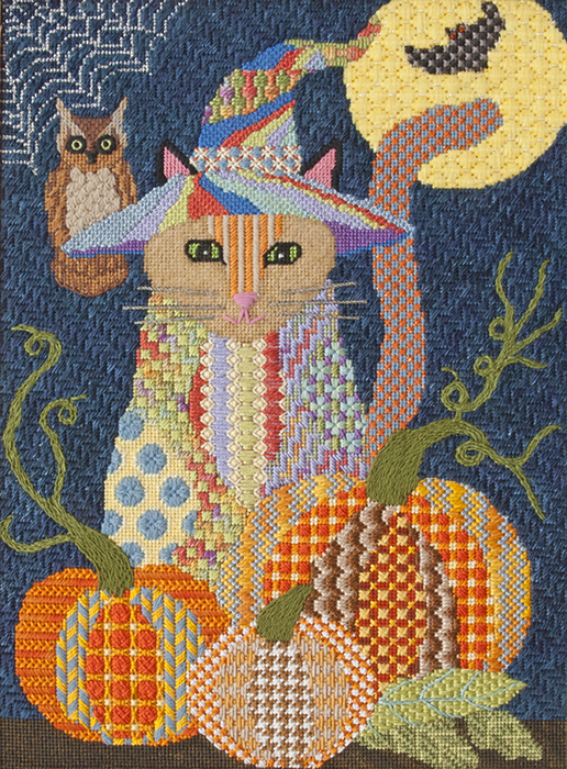 This calico cat by Danji Designs was stitched in the winter months before the trees budded out. The piece caught my eye because there were so many painted pattern areas. I selected stitches and changed some colors to go with a beige cat face instead of the original bright yellow face. The Milanese background in an overdyed blue navy was a challenge to execute behind the spider web done in cross stitches. The batik fabric was found after the piece was completed and placed in order to enhance the bright moon.
