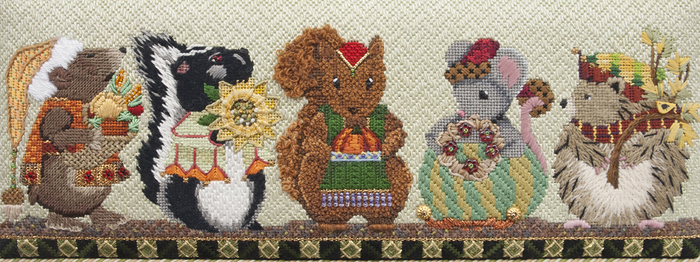 My garden hobbyist husband delighted to see these creatures on a painted canvas by Melissa Shirley. It was a fun piece to stitch. The challenge was to find different stitches for each animal; basketweave with velvet, interlocking Gobelin, knots, and long and short. The background is horizontal medieval mosaic and the dirt was stitched with an overdyed floss in serendipity.