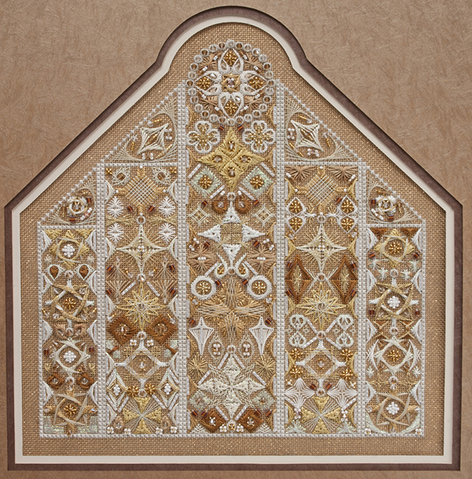 La Misión – Conception evolved from a previous design of a cathedral window, however, this time I wanted to portray an entire wall of stained glass, not just a single element. I started with the borders in order to get the scale that I wanted; next I added the larger motifs inside each column. Each column has its own stitch variations and, except for the center column, may be stitched as is or rotated 180 degrees to add variety. When stitching the Conception colorway, I painted the canvas gold and chose a selection of threads that ranged from white to dark bronze in color, with a variety of textures, in order to capture the opulence of many cathedrals. Once the stitching was completed, hundreds of beads and crystals were added to enhance the stained glass effect.