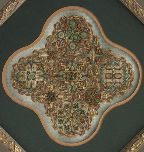 I brought the design to life with Gloriana Apricot Grove overdyed silk, a personal favorite, on a Vintage Santa Fe Sage canvas. The rest of the silks and metallic threads were chosen to complement the Gloriana. I love the accent that the holographic Kreinik made, but you could never make me stitch with it again! Once the stitching was complete, I selected crystals and an array of beads to finish the piece.