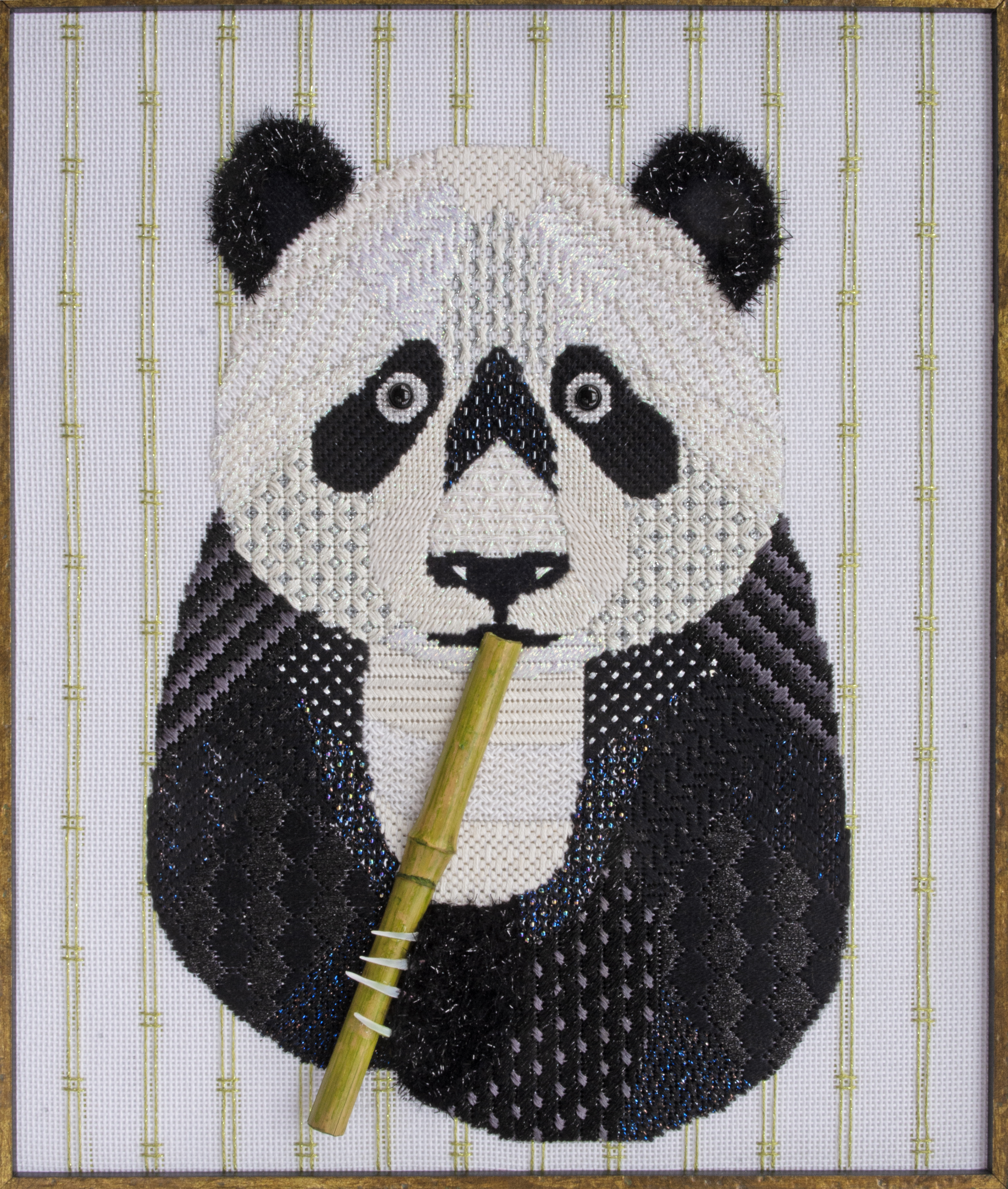 Peng Ling is cheerful patchwork panda. His black and white colors are highlighted with the subtle greens of the bamboo-style open background and the fun bamboo embellishment he is munching. I used many Rainbow Gallery silks and metallics to create texture and subtle color differences in the white and black areas along with beads in a few areas.