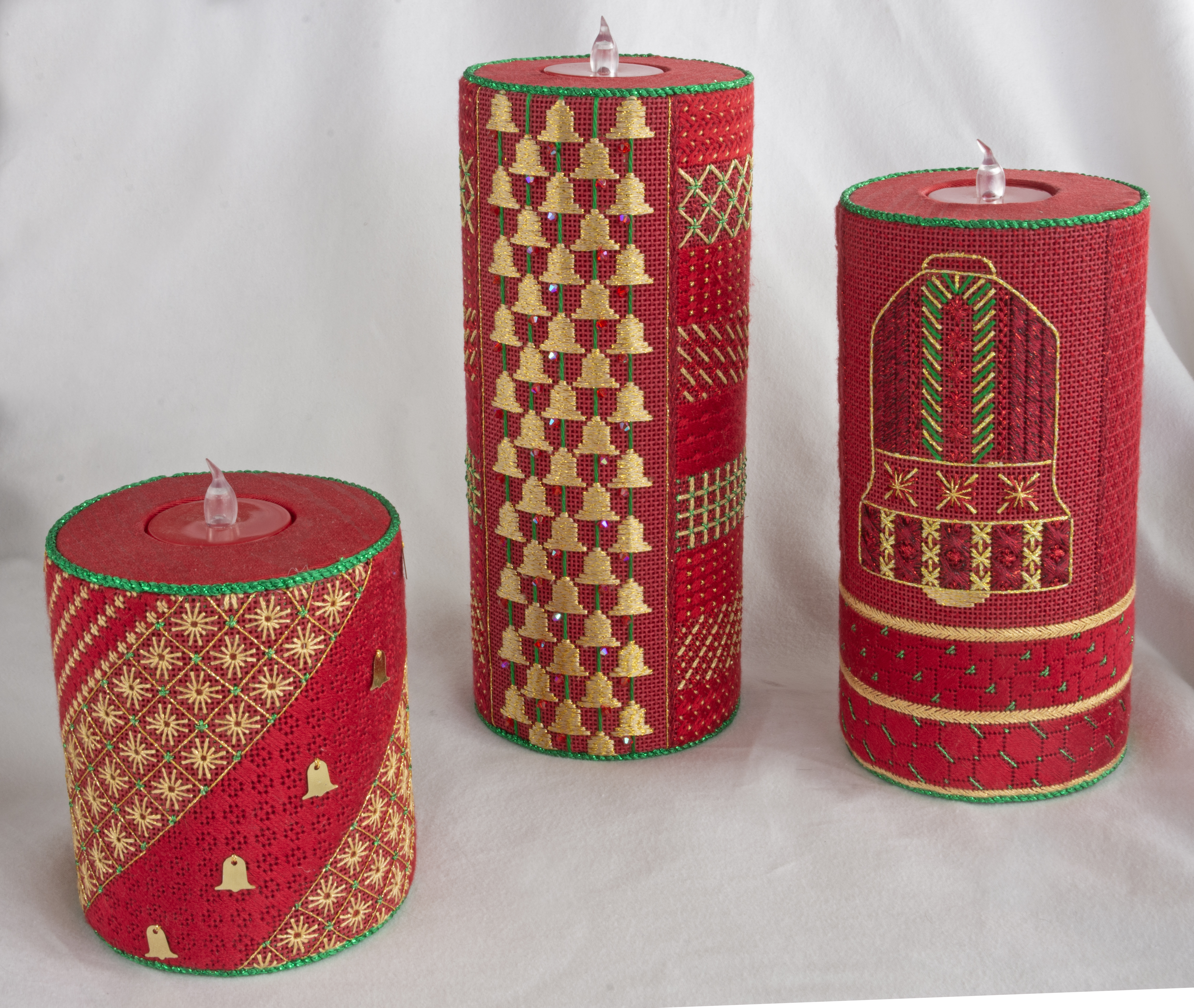 Each 3-D candle is approximately 3½” in diameter and they vary in height from 4” to 8”; they are stitched on Victorian Red 18-count mono canvas. The finishing adds a color-matched, battery-operated tea candle, set in the top of each stitched candle to create a special glow just as a real candle would.