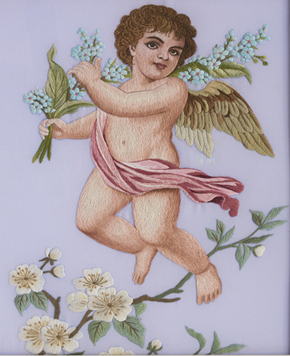 To have needle art carry the soul of the artist, the first technique is to meditate. I do it every day and love everything. So, I decided to hand embroider this piece. Materials include white fabric and Vietnamese cotton threads. To hand embroider a portrait, I prefer to use cotton threads because there are certain colors that match human skin color. Stitches are mostly long and short, satin stitch, French knot, and stem stich. The problem that I ran into is that if I hand embroidered an angel at a small size, I would not be able to express or bring my soul into the piece. Consequently, I increased its size from 10ʺ x 8ʺ to 14ʺ x 11ʺ. Given my family background in this form of needle art, hand embroidering a portrait of angel, God, or Buddha cannot be done in a small size because it is so hard for professional artists to express their soul in choosing and blending threads color, and the needle art will not show its true value.