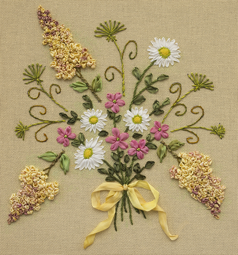 This charming bouquet of spring flowers was designed as a teaching piece with the beginning silk ribbon student in mind. Dimension and texture are created using a variety of silk threads and ribbons in varying widths and thicknesses.