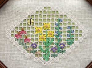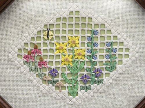 In the past, I figured out how to needleweave flowers, a butterfly, and leaves in Hardanger. I wanted to use them in one design. So, I found photos of Minnesota wildflowers, built in a frame of modified klosters, and began weaving. Working between designing on paper and stitching the model, I added harebells, violets, and a butterfly and then designed and added marigolds and coneflowers. My husband suggested that a wildflower garden must have mushrooms, so I found a place to weave mushrooms.