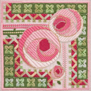 A delightful little piece designed as a 5” x 5” boxtop, it is inspired by the MacIntosh Rose and is stitched using, among others, the diagonal mosaic stitch, alternating scotch stitch, Basketweave, and a leaf stitch motif. Various overdyed cottons and silks, as well as stranded cotton floss, are used to bring this rose to life. This is an expansion of a smaller boxtop and repeats the motifs for a larger composition. It brings together two of my favorites: the art of Charles Rennie MacIntosh and the leaf stitch. I tried to show dimension through the use of differently scaled stitches in the progression of color. The rest is pure fun.