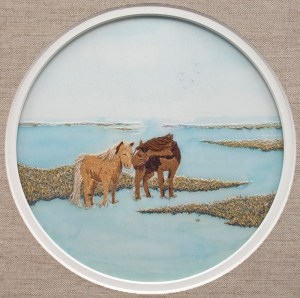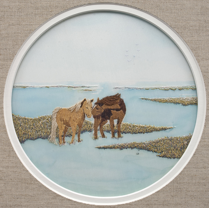 The sky and water were painted on silk habotai using the Serti technique, a process of applying wax resist to preserve white areas, applying paint, and then removing the resist. The grasses were created with free machine embroidery. Hand stitching the horses in silk and wool made them stand out in bas relief from the rest of the design.