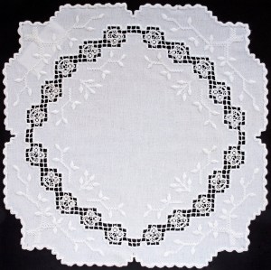 I decided to design an owl for the retreat. Since my passion is Hardanger embroidery, it of course had to be in Hardanger. After reviewing owls in clip-art and doodling on graph paper, I drew an owl that I could interpret into Hardanger needleweaving. The owls came first, then the border, and finally the tree was designed to fill in too much white space.