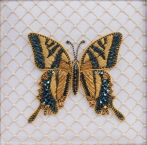 The tiger swallowtail butterfly is so interesting because its vivid dark jagged stripes against yellow wings look like the fur of a tiger. I have chosen to create a graceful, jeweled, classically colored female of the species, papilio glaucus, as the male lacks the bright color blue and the gaudy golden topaz color of the rear wing edges. This stitched version is almost life-sized, but I did have to take artistic liberties due to the scale of the media. Butterflies are so amazingly delicate! The size of the stitching materials made it impossible to achieve an exact biologically correct result.