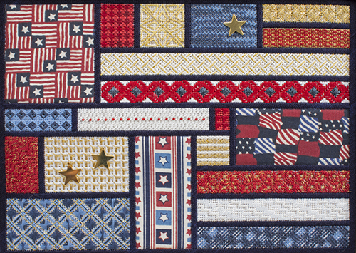 Old Glory with a new twist becomes New Glory, a modern patchwork flag celebrating patriotic themes. This “flag” combines fabric applique, fun stitching, and embellishments to create a wonderful Independence Day (or any other time) decoration. Each fabric area is padded with wool felt, fused to the canvas and then the stitched borders in the design secure the fabric even more. The stitches with threads, including Sparkle! Braid, Neon Rays+, Fyre Werks, Silk Lame’ Braid, Planet Earth Silk, Gloriana Silk, Gumnuts Stars, are a combination of old favorites and some variations on laid fillings. The gold star embellishments and red beads add the perfect touch to several areas of our “flag”.