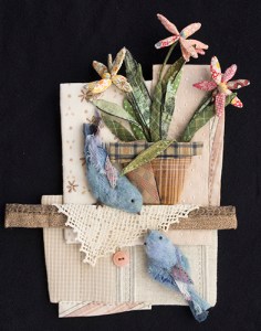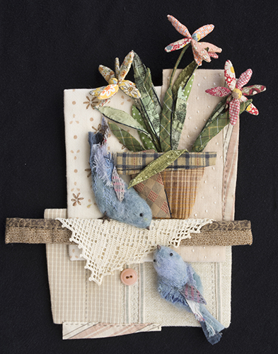 Too awake to call it a day and too tired to sew, one of my favorite evening past times is to curl up on the sofa with my kitty and husband to sketch. Calico Blue came about from one of these doodling exercises. While most of my sketches remain in a folder, I thought this whimsical piece presented the perfect opportunity to attempt my idea of using water-felted wool to visually soften the body of little fabric birds. I was so delighted with the results that I’ve continued using this technique in other pieces of artwork. I was also pleased to discover that by reinforcing the flower stems with heavy gauge wire, I could extend the calico flowers out of the picture background just as it was initially drawn.