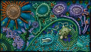 I enjoyed this beading experience. I attempted to incorporate many of the dimensional techniques presented in our class, and also added some beads of my own to the finished project. I loved being able to create my own scene. At first, it seemed very daunting; but as my imagination started seeing different possibilities, it became fun to decide which ideas to do and how to bead them to create a unified effect.