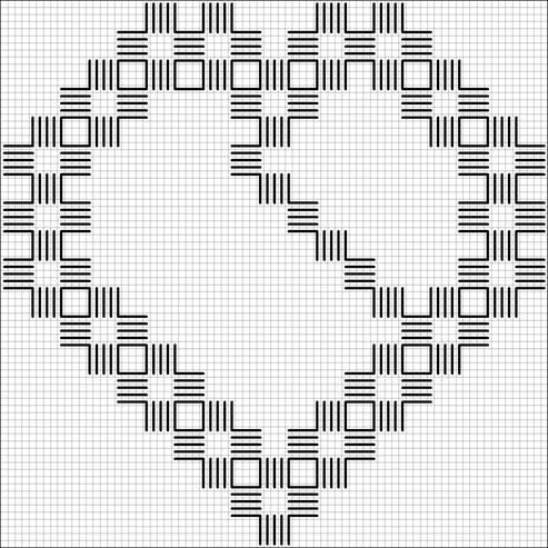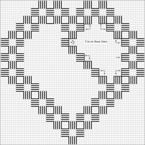 When the motif in the upper right hand area is totally enclosed you may cut away the unnecessary threads. You will need good, sharp, pointed scissors. First, examine your work. You will notice that some stitches lie parallel to the fabric threads; some lie perpendicular. You will cut only those fabric threads that are perpendicular to the Kloster Blocks. The places to cut are indicated on the following chart. When you cut be sure that you cut only the four fabric threads that are enclosed by the stitches of the Kloster blocks. To ensure this, bring the tip of the scissors up so that you can see that there are only four canvas threads on the scissors blade. Then make your cut.