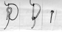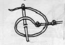 More often a Kloster will lie at a right angle to the preceding Kloster. Notice that the first stitch of the new Kloster shares a fabric hole with the last stitch of the old Kloster. Notice also that all stitches are taken from the inside of the shape toward the outside of the shape.