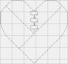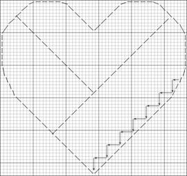 Work the Faggot stitch beginning at the lowest tip of the heart. Pull the canvas as you work. If you find your canvas is hard to pull, use water on a cotton swab and dampen the canvas on the line of stitching. The holes may not show up well until the second row is stitched. At the end of each row secure the thread at the end and wrap it around a backstitch on the back to start the next row.