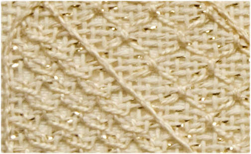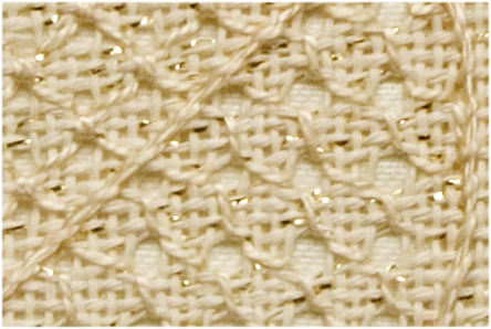 Work the Honeycomb stitch over 3 threads. Start at the top center point. The second row may be worked up either side of the first row. The pull is on the vertical wrap. The rows share the pulled stitch.