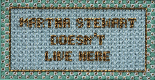 I try to keep my house German clean and neat enough that whenever someone comes to visit it looks nice. No matter how hard I try I can never get it as clean and neat as I would like. Not to mention, I don’t have much flair for decorating. My house is mainly “Early Attic.” I am not Martha Stewart, deal with it. I really wanted the saying to stand out, hence the beads. The little blue and white blocks in the background are stitches I dreamed up for the piece, and not from a book.