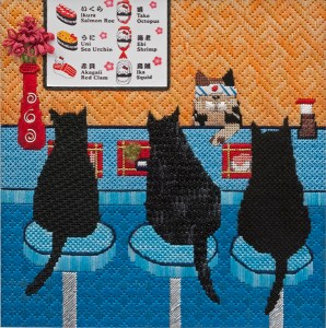 My daughter and her husband have three cats and love sushi, so this canvas was perfect for them. A big problem on this canvas was creating the menu above the cats so the small lettering could be read. I went to the Internet and found the Hello Kitty menu online. I used Kreinik double-sided adhesive to attach the menu to the canvas.