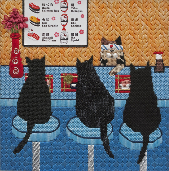 My daughter and her husband have three cats and love sushi, so this canvas was perfect for them. A big problem on this canvas was creating the menu above the cats so the small lettering could be read. I went to the Internet and found the Hello Kitty menu online. I used Kreinik double-sided adhesive to attach the menu to the canvas.