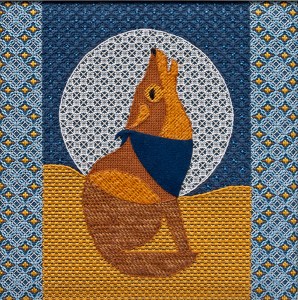 The coyote print has wonderful flowing lines and soft curves and this “howling in the moonlight” pose is the most popular way to depict this nocturnal hunter. It was fun to create my version of an appropriate moonlit landscape for this wily creature and a charted back stitch outline was used to set up the precise dimensions of the moon and the coyote figure.