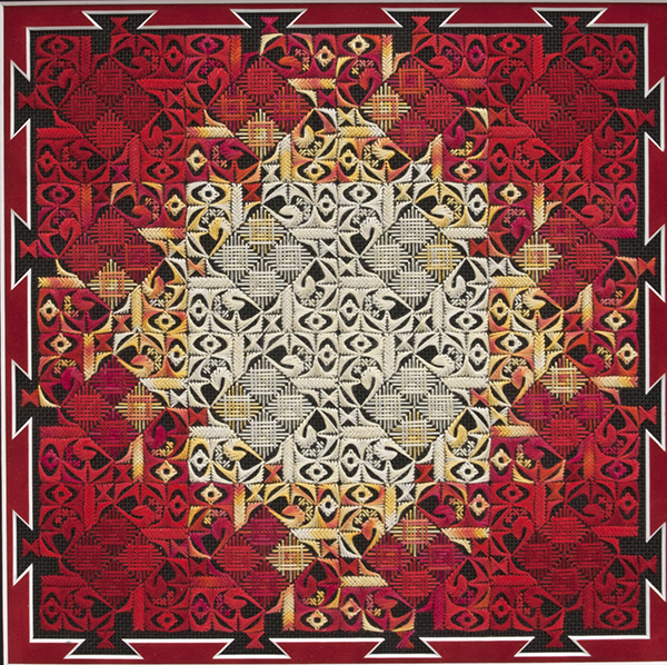 This was a class I took at the ANG seminar in Milwaukee several years ago. I loved the colors of the piece, but Ro Pace (the designer) had intended it to be stitched on a cream canvas with gold flecks.