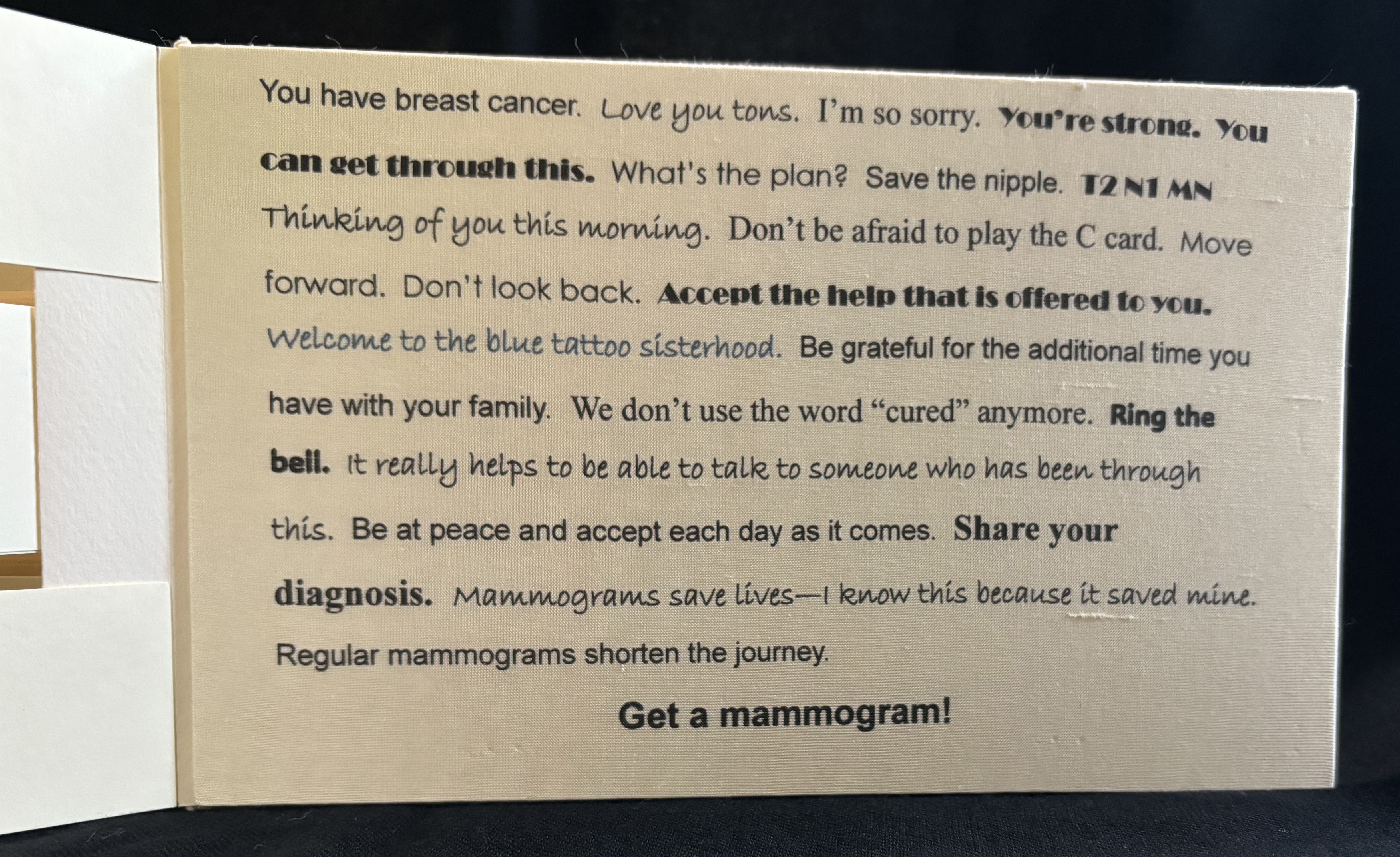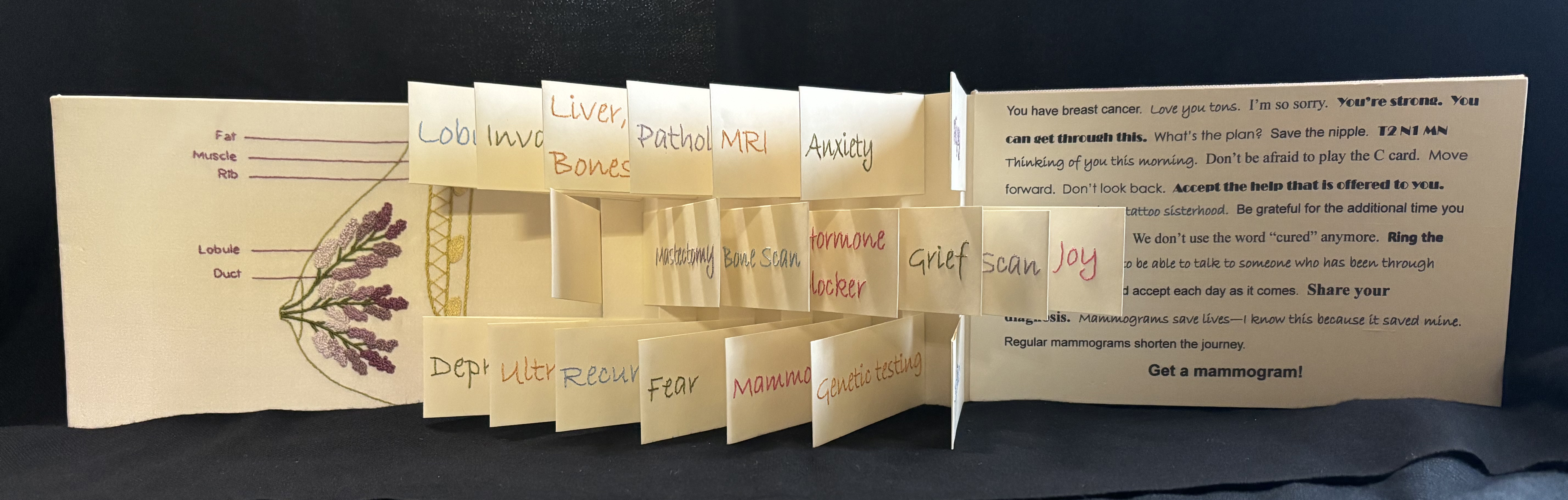Click on the images below to see enlarged views of Celeste’s Teacher cum Laude expertise piece, Get A Mammogram, and to read her artist statement. To view more examples of Celeste’s book art, click here.