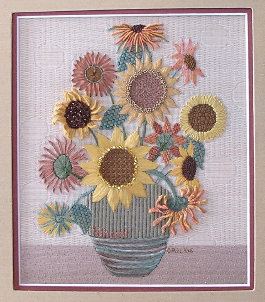 Tribute to Vincent is my interpretation of this same theme; it is based on Van Gogh’s work, but is interpreted in needlework. It is also a study in analogous colors, and is a sampler of raised techniques to effect texture. One flower will be worked in detached needleweaving. Another is rendered in bullions. Other stitches are employed to give depth and dimension to the design, all the while working in glorious values of yellow and its analogues. Indeed, this design has become a sampler of embrodery techniques, but remains pleasing to the eye in its unity f color and shape.