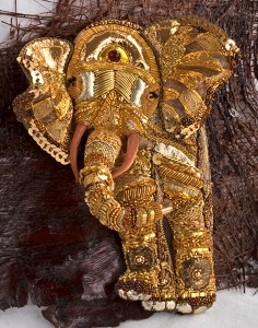 This stumpwork elephant was constructed in separate parts and then assembled. I attempted to give the elephant a feeling of charging out of the brush by padding the knee of the raiser foot and by mounting the completed embroidery on a piece of a palm tree which I flattened and then stiffened with several layers of glue.
