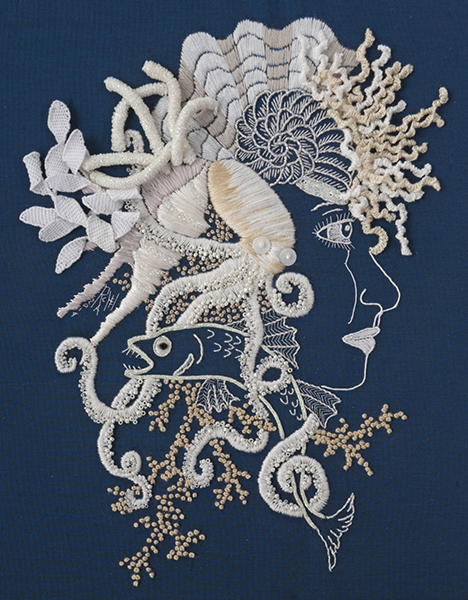 This picture was stitched using perle cotton, metallic silver thread, beads, and several shades of ecru silk thread. The sea anemone she wears on her forehead is drizzle stitch; the seaweed on the back of her head is needle lace. The sea worms consist of wrapped cording and the octopus and large shell were padded with felt to give dimension.